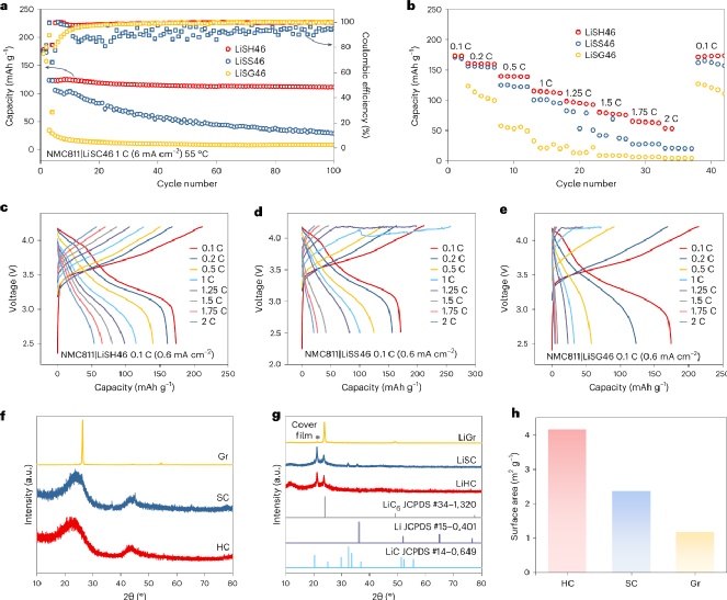 將LiSH46負極中的硬碳替換為軟碳(LiSS46)和石墨(LiSG46),組裝硫化物全固態電池,在大電流下仍然發生了微短路,且LiSG46的全固態電池循環表現了較低的容量。LiSH46負極中,硬碳具有相較于石墨和軟碳更大的無序度、層間距和比表面積,為鋰析出提供了大量位點。另外由于硬碳接近0V的嵌鋰平臺以及更高的鋰擴散系數,誘導鋰遷移進入電極內部,并從硬碳的表面均勻析出。所以硬碳可以更有效地抑制鋰硅合金鋰沉積過程的枝晶生長。