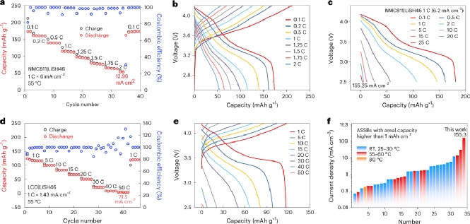 硬碳穩定化鋰硅合金負極組裝全固態電池,可以實現優異的倍率性能。匹配6.48mAhcm-2的NMC811正極,可以在12.96mAcm-2的電流密度下充放電,不發生明顯的微短路。匹配1.43mAhcm-2的LCO正極,可以在71.5mAcm-2的電流密度下充放電,不發生明顯的微短路。