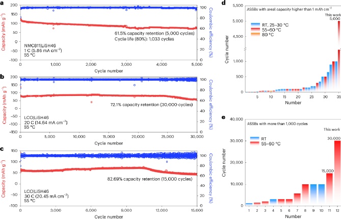 硬碳穩定化鋰硅合金負極組裝硫化物全固態電池,可以實現優異的長循環性能。匹配5.86mAhcm-2的NMC811正極,可以在5.86mAcm-2(1C)下循環,首周可逆容量達3.6mAhcm-2,循環壽命為1033圈,在循環3000(5000)圈后容量保持70%(61.5%)。匹配0.73mAhcm-2的LCO正極,可以在14.64mAcm-2(20C)和20.45mAcm-2(30C)下循環30000周和15000周,容量分別保持72.1%和80%。