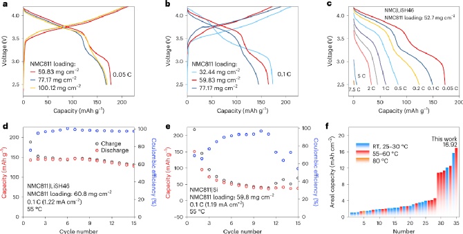 硬碳穩定化鋰硅合金負極組裝硫化物全固態電池,可以實現高負載全固態電池。LiSH46負極可以起到保護層的作用。使用12mAhcm-2的LiSH46負極,可以匹配20mAhcm-2的NMC811正極充放電,不發生明顯的微短路,此時,電池層面的能量密度為263Whkg-1,而電解質層為80mg的粉餅,如果使用電解質薄膜將進一步提升電池的能量密度。