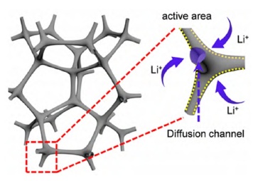 關于調控石墨負極結構,研究人員采用化學氣相沉積(CVD)方法,得到了高度支化的氮摻雜石墨(BNG)管狀泡沫負極(圖1)。優化后的C–N鍵作為活性原子域,激發Li+擴散,將相對惰性的初始碳材料轉化為活性材料,實現低溫循環下鋰離子在材料中的可逆脫嵌,引入的氮原子擴大了石墨材料的層間距,改善了Li+在低溫下的擴散動力學,在-10℃下,獲得了良好的可逆容量和循環穩定性。同樣為了縮短Li+擴散路徑,也有研究者開發了由具有通孔的薄石墨片和碳納米管組成的電極。該通孔使鋰離子可以在層與層之間傳輸,有效地縮短了鋰離子擴散路徑;碳納米管可以有效防止石墨片的重疊,結合低去溶劑化能電解質,促進鋰離子在電極/電解液界面的傳輸。制備的電池具有優異的低溫性能。