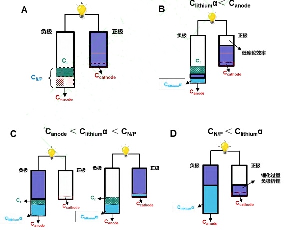 則鋰化裕度為CDLRP,可描述為Clithiumα與Canode和CN/P的差值,如圖1B所示,若Clithiumα<Canode時,鋰化裕度太小,補鋰深度不夠,則石墨負極中仍存在不可逆容量,首效較低;如圖1C所示,若Canode<Clithiumα<CN/P時,鋰化石墨負極內部含有電化學活性的鋰離子,鋰化裕度合適;如圖1D所示,若CN/P<Clithiumα時,鋰化裕度過大,鋰離子富余,則導致析鋰,能量密度降低等問題。