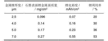 不同厚度金屬鋰的利用率及其鋰化裕度值
