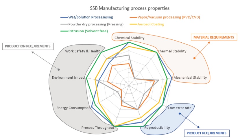 綜上所述,在簡要介紹了材料、潛在市場影響和SSBs背后的技術之后,作者首先介紹了所有目前使用的技術,從小實驗室規模開始,到最初的原型制作和工業嘗試,然后根據排除標準進行了評估,這些排除標準側重于實現低成本、高產量、可靠和易于擴展的制造工藝,此外,該工藝對環境友好,并最大限度地降低了與人類健康和工作安全相關的風險。