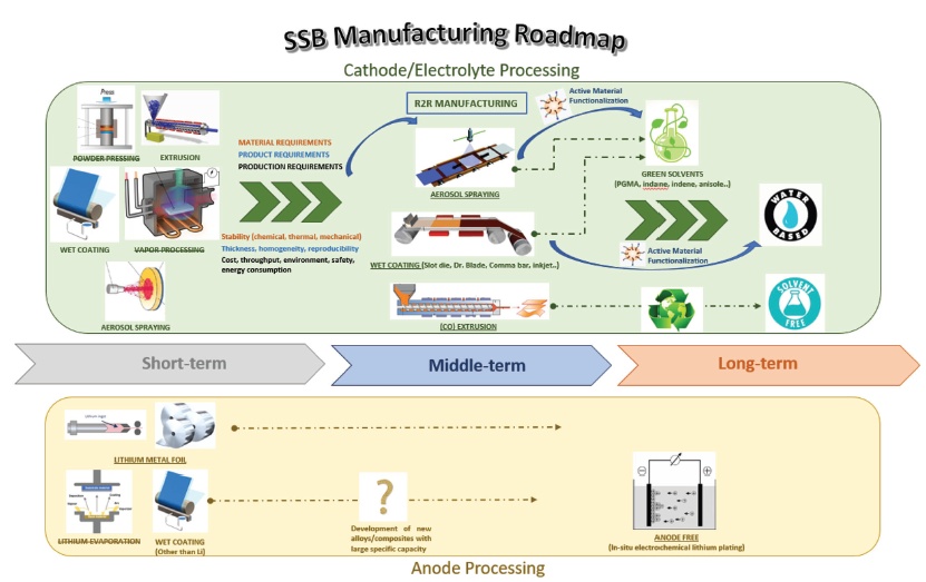 SSB制造最有可能的路線圖如圖4所示。關于陰極和電解質的加工,有三種平行的方法可用于嘗試在中短期內以低成本和高產量的工藝放大和大規模制造SSB。關于陽極制造,鋰金屬箔在中短期內仍將是首選。如果開發出比容量大的新合金和復合材料并對其進行功能化以使其可溶,濕法涂層工藝在中長期內也是一種選擇。當電池充電時,通過電化學電鍍原位沉積鋰的無陽極設計毫無疑問是一種非常有前途的長期替代方案,隨著技術的成熟和新材料的研究/開發,它將被逐漸引入。