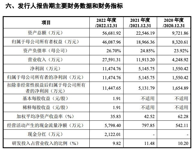 報告期內,志橙半導體經營業績實現高速增長,2020年、2021年和2022年,公司分別實現營業收入4,248.92萬元、11,913.20萬元和27,591.31萬元,實現歸屬于母公司股東的凈利潤分別為1,550.42萬元、5,145.75萬元和11,474.76萬元。