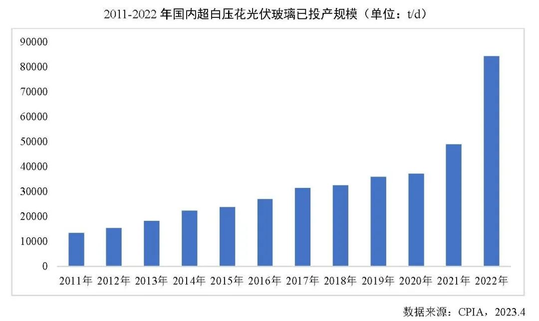2022年,我國光伏玻璃產量約占全球產量的90%。2022年1-12月,國內超白壓花光伏玻璃產量約1606.2萬噸,同比增長53.6%。