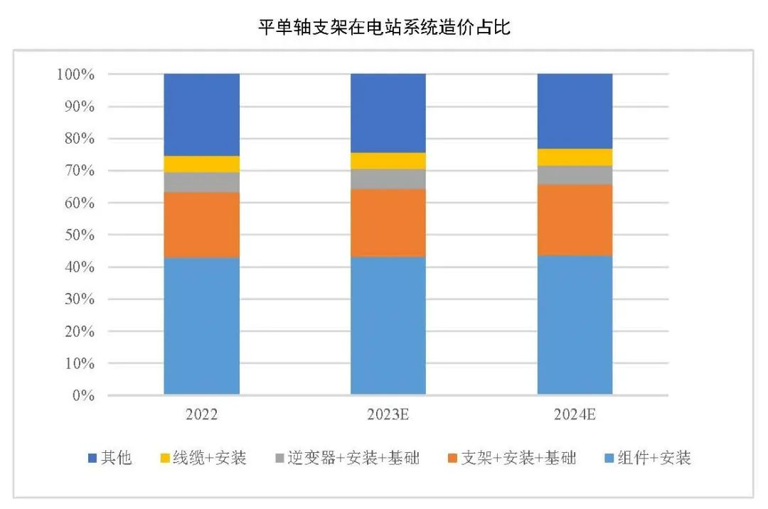 光伏支架是太陽能發電系統中為擺放、安裝、固定太陽能面板而設計的特殊支架,在整個地面光伏發電系統的成本構成中,視應用場景不同,支架系統(含基礎)及安裝成本約占電站投資成本的12%-18%,且對光伏發電系統的壽命及發電效益均有重要影響。2022年由于組件價格的上漲,導致其他系統成本占比降低,支架系統(含基礎)及安裝成本約占電站投資成本10%-12%。