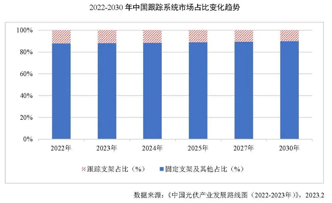 從國內市場來看,由于跟蹤支架能夠顯著提升發電量,依照當前跟蹤支架的成本來測算,國內超過20個省、市的地面光伏電站項目安裝跟蹤系統,具有較好的經濟性。而隨著跟蹤支架成本的不斷下降,以及國內跟蹤支架企業技術和產品的不斷成熟,我國跟蹤支架的市場占比將呈現穩步上升趨勢,根據《中國光伏產業發展路線圖(2022-2023年)版)》預測,未來隨著其成本的下降以及可靠性的解決,跟蹤市場占比將穩步提升。2023年,伴隨國內大基地的穩步推進和及時的并網,這也將加速跟蹤支架的推廣應用。
