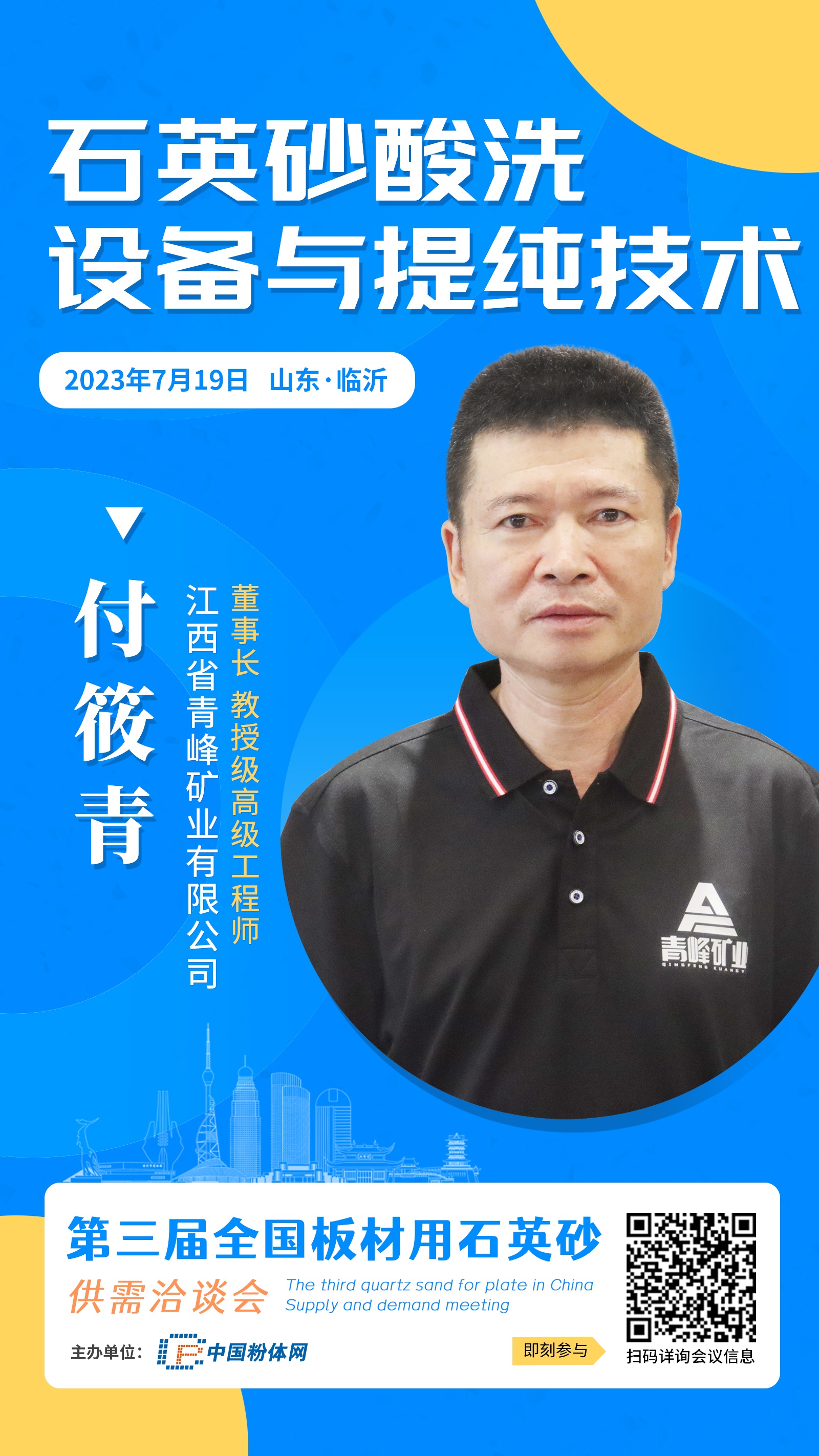 2023年7月19日,中國粉體網將在山東臨沂舉辦“第三屆全國板材用石英砂供需洽談會”。屆時,江西省青峰礦業有限公司董事長付筱青將帶來題為《石英砂酸洗設備與提純技術》的報告,他將介紹如何用環保的方式對石英砂進行酸洗,敬請期待!