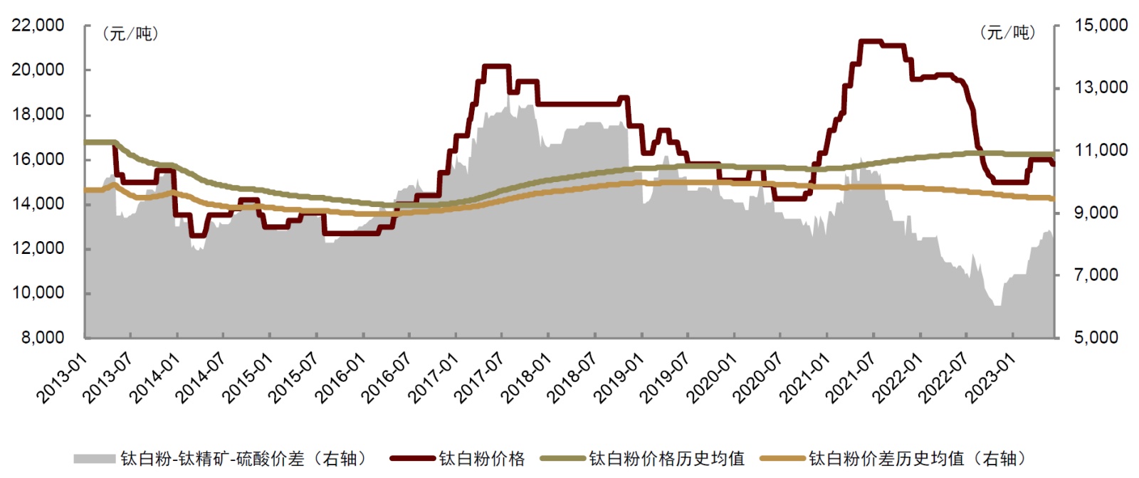 2H22需求走弱導致鈦白粉價格下滑,需求回暖推動1Q23鈦白粉漲價。受原材料價格上漲推動,2022年上半年鈦白粉價格小幅上漲但價差開始逐步收窄;進入下半年以后,受海外加息、國內地產基本面下行等影響,全球鈦白粉需求走弱,鈦白粉價格進入下行周期。2022年底部分企業出現負毛利情況,企業挺價意愿增強,鈦白粉價格見底,隨著需求端環比改善,1Q23以來鈦白粉價格逐步上漲,疊加硫酸等原材料價格回落,鈦白粉價差開始逐步向好,截至目前鈦白粉價格相較2023年初以來上漲5.3%,但同比去年仍下降19%。目前鈦白粉價格/價差分別為15,800/8,212元/噸,處于2013年以來53%/15%分位。