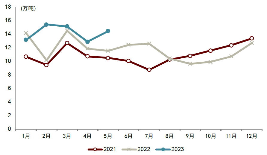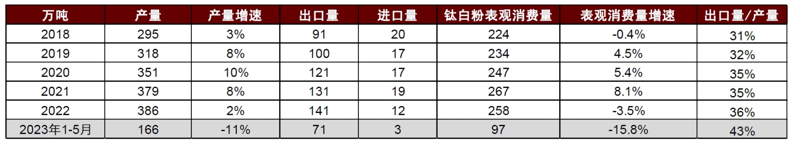 受宏觀經濟及房地產疲軟影響,2022年國內鈦白粉表觀消費量略有下滑。2022年國內鈦白粉產量386萬噸,同比2021年增加2%;鈦白粉表觀消費量258萬噸,同比下降3.5%。由于國內需求疲軟,以及多數鈦白粉企業盈利承壓而主動減產,2023年1-5月國內鈦白粉產量166萬噸,同比下滑11%;2023年1-5月國內鈦白粉表觀消費量97萬噸,同比下滑16%。