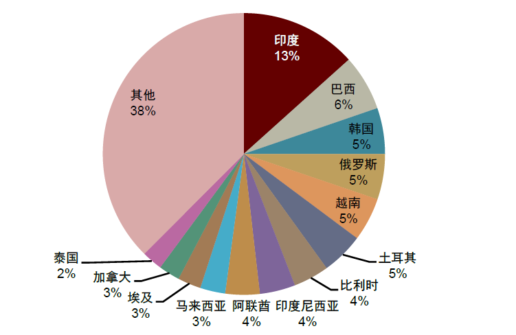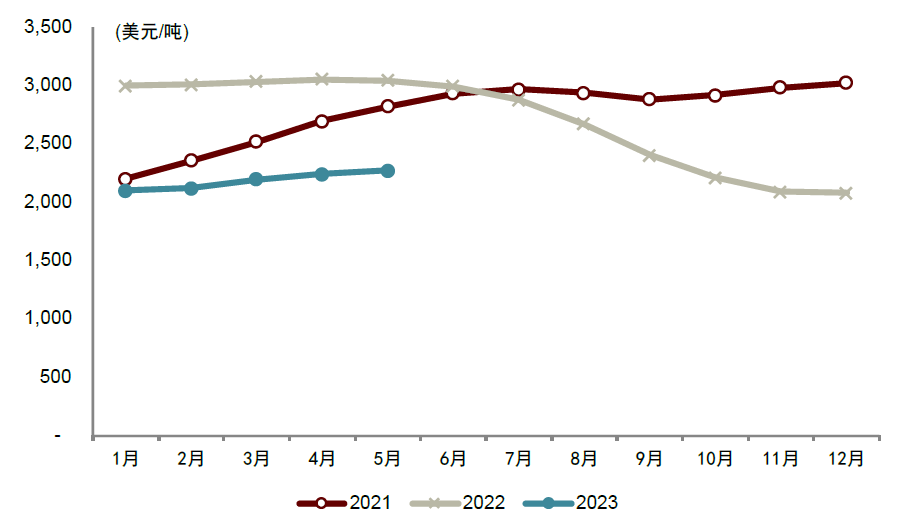2023年1-5月出口量同比快速增加,國內企業全球市占率持續提升。新興經濟體經濟發展及基建行業快速增長,拉動涂料及上游鈦白粉需求增加,根據海關總署,2015-22年我國向印度/巴西/印度尼西亞/韓國/土耳其出口鈦白粉量年均復合增速為16.9%/10.4%/9.7%/7.7%/24.2%。2022年我國鈦白粉出口量持續增長,全年出口鈦白粉141萬噸,同比增長7.2%。在全球加息、經濟增速放緩的宏觀環境以及1Q23海外鈦白粉龍頭公司銷量下滑情況下,2023年1-5月中國鈦白粉出口量同比增長14.2%至71.1萬噸,國內鈦白粉企業加速搶占國際市場份額。價格方面,因整體鈦白粉需求較弱及供給端龍佰集團等公司產能投放影響,2022年下半年出口均價進入下行通道,2022年12月鈦白粉出口均價同比下降31%至2,080美元/噸;2023年以來鈦白粉生產企業挺價意愿較強疊加需求逐步改善,2023年5月鈦白粉出口均價2,272美元/噸,同比下滑25%,相比年初以來上漲8.3%。