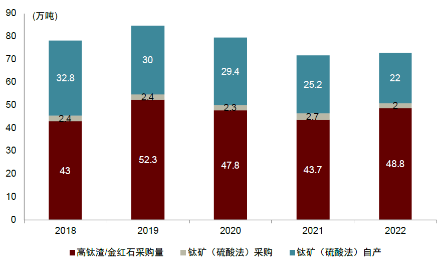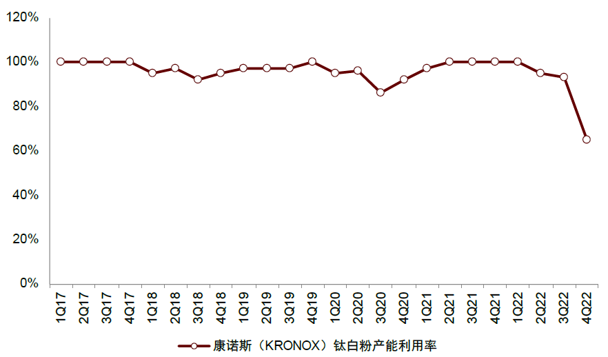 ► 康諾斯2022年營收/EBITDA利潤率同比減少0.5%/9.7%。2022年康諾斯營業收入同比減少0.5%至19.3億美元,EBITDA同比減少9.7%至2.03億美元,主要是由于鈦白粉售價上漲不足以抵消銷量下降、生產成本(包括原材料和能源成本)上升的影響。受需求較弱影響,康諾斯3Q22起鈦白粉銷量開始下滑,4Q22公司產能利用率降低至65%。1Q23公司實現營收4.26億美元,同比下滑24.3%;EBITDA實現-5億美元,同比下滑105%。1Q23公司實現鈦白粉銷量10.2萬噸,環比4Q22有所恢復但仍同比下滑29%,且毛利率仍在持續降低。原材料配套方面,2022年公司自產鈦礦22萬噸,外購鈦礦/金紅石(或高鈦渣)2/48.8萬噸。