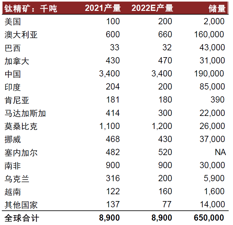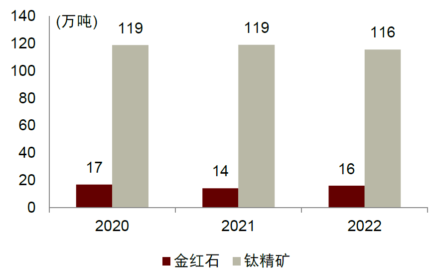 鈦精礦約占全球鈦礦物消費量的90%,2022年全球產量同比基本持平。根據USGS,2022年全球鈦精礦產量預計為890萬噸(折TiO2),同比2021年持平;其中中國、莫桑比克、南非為前三大生產國,產量分別為340/120/90萬噸,全球占比分別為38%/13%/10%。2022年全球金紅石礦產量59萬噸,同比下滑4.5%;澳大利亞、塞拉利昂、南非為前三大生產國,產量分別為19/13/9.5萬噸。儲量方面,全球鈦精礦儲量6.5億噸,金紅石礦4,900萬噸,中國、澳大利亞、印度、南非等國家儲量排名靠前。