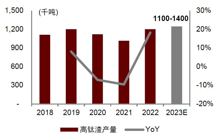 ► Rio Tinto:2018-22年高鈦渣產量維持相對穩定,2022年氯化法鈦渣價格同比+19%。2022年公司實現高鈦渣產量120萬噸,同比+18%;1Q23產量28.5萬噸,同比+4%,根據公司年報,2023全年指引110-140萬噸,同比變化-8%~27%。受宏觀經濟環境疲軟影響,2022年鈦礦下游鈦白粉的需求增速較低。但原材料端,全球受高品位礦供應緊張的影響,鈦礦價格上漲。向前看,公司預計2023年雖庫存水平可能有所回升,但礦體貧化等結構因素仍然存在,高品位鈦礦價格仍有望維持高位。