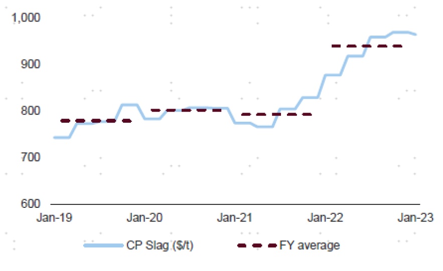 2022年全球鈦礦行業迎來較高景氣期:1H22全球鈦白粉因新冠積壓的建筑和翻新需求釋放,鈦白粉生產企業滿負荷運營致使鈦礦供不應求;同時氯化法產能占比逐步提升拉動對高品位鈦礦原材料的需求,上半年鈦礦供應緊張。2H22雖然在加息等因素影響下歐美鈦白粉需求走弱,但鈦礦特別是高品位礦新增產能有限,供需依舊維持偏緊的狀態,鈦精礦價格仍維持高位,全年價格大幅上漲推動Rio Tinto、Base、Iluka等公司業績增長。