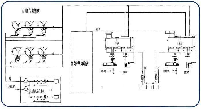 本系統中,兩臺或兩臺以上的倉泵組成一個輸送單元,向一條輸送管中同時輸送,與單位倉泵系統比較,大大提高了系統的輸送效率,系統的經濟性提高。該系統主要用于較大灰量的除塵器灰斗。