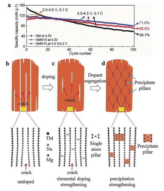 (a)不同充放電電壓區間的循環性能;(b)未引入摻雜元素的層狀材料;(c)常規摻雜元素;(d)引入高密度納米沉淀相構建三維網絡結構有效抑制開裂