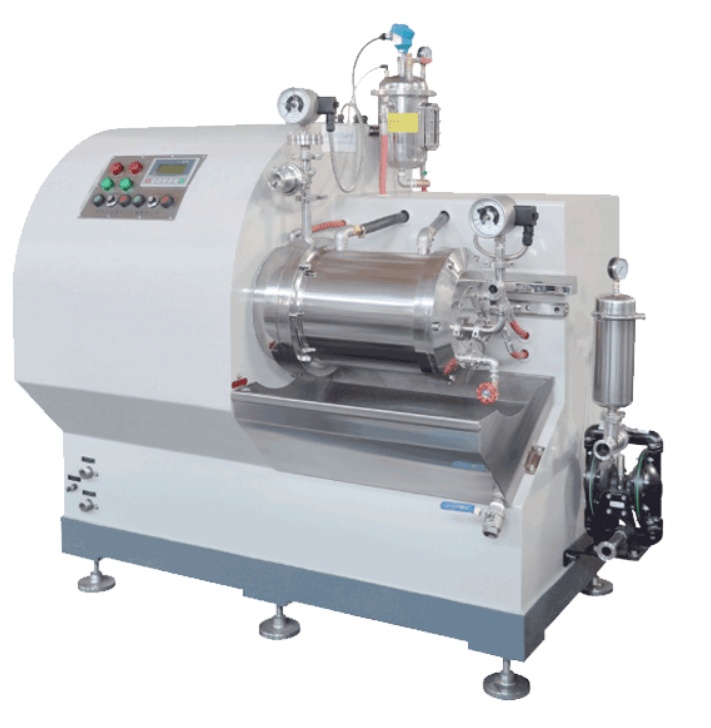特殊轉子結構設計,數量和體積及安裝位置按流體力學設計,達到最大比研磨能量,提高物料研磨效率,使物料達到納米級,經第三方馬爾文激光粒度測試儀測定,最小細度可達小于50mm。物料隨著進料泵由頂端進入研磨腔,隨著轉子的旋轉而均勻分布,在轉子和定子縫隙內渦流離心力作用下對物料進行徹底的預分散處理。在接下來強烈的研磨中,轉子和定子對研磨介質連續發生劇烈的撞擊變化,研磨介質再作用于物料,物料得以研磨,研磨后的物料在研磨腔停留特定的研磨時間,從而得到一個極窄的產品粒度分布帶,在進料泵壓力和離心力作用下,由于密度的不同,研磨介質返回研磨腔,物料卻沿著離心力相反的方向經濾網式分離器過濾分離,循環往復。