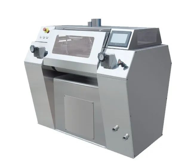 DYS液壓三輥研磨機是公司設計的一款適用于各種粘度物料的三輥機。該系列的冷卻效果為傳統液壓三輥研磨機的3倍以上,可以使研磨輥以更高的速度運行,最高轉速可以達到600rpm轉以上,以滿足客戶對高剪切力,以及高生產力的需求。輥筒的動作是通過液壓系統驅動,并且客戶可根據自身需要為機器定制高精度的間隙微調裝置。該系列三輥機采用PLC人機界面控制,可以遠程與ERP連接。優點