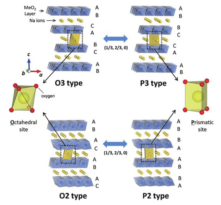 鈉離子電池過渡金屬氧化物正極材料依據其材料結構的不同可分為二維層狀金屬氧化物與一維隧道型金屬氧化物。鈉離子電池層狀過渡金屬氧化物(NaxMO2,M為Ni、Mn、Fe、Co和Cu等過渡金屬元素)的理論比容量(240mAh/g)與實際比容量(200mAh/g)相對較高,此種材料中過渡金屬元素原子與鈉離子以一定的配位方式組成。Delmas等按照Na+的含量與配位方式將此種材料分為八面體型(O型)和棱柱型(P型),O型結構鈉離子位于八面體中的空隙,P型結構鈉離子位于棱柱中心的空隙。按照氧層的堆疊順序,八面體型(O型)可分別分為O2、O3堆疊方式,常見的堆疊方式為O3型,這種構型中Na+離子含量高,因此初始容量也高,但倍率與容量保持率差。同理,棱柱型(P型)結構也可分為P2與P3型,P2型具有寬的鈉離子傳輸通道與較低的離子遷移能壘,但由于其鈉含量低,因而初始容量低,且極易發生由P2轉變為O2的相變從而影響穩定性;P3型則有相對O3型較低的擴散能壘和較低的燒結溫度,但其晶體結構對稱性較差,鈉離子脫嵌時過渡金屬層滑移矢量多,會產生復雜的相變從而導致嚴重的容量衰減。