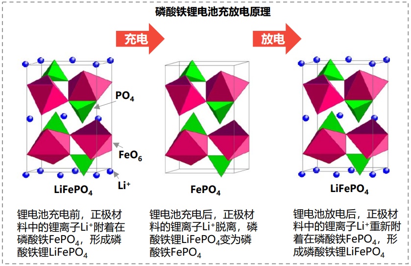 磷酸鐵鋰在鋰電池中的工作原理是:充電時,Li+從正極 LiFePO4 脫嵌出而形成貧鋰相的LixFePO4,最終生成FePO4,脫出的Li+經過電解質溶液進入負極,同時電子從外電路由正極向負極移動,從而實現正負極的電荷平衡。放電時,Li+從負極脫嵌,經過電解質溶液嵌入FePO4 正極,形成富鋰相LixFePO4,從而形成 LiFePO4。