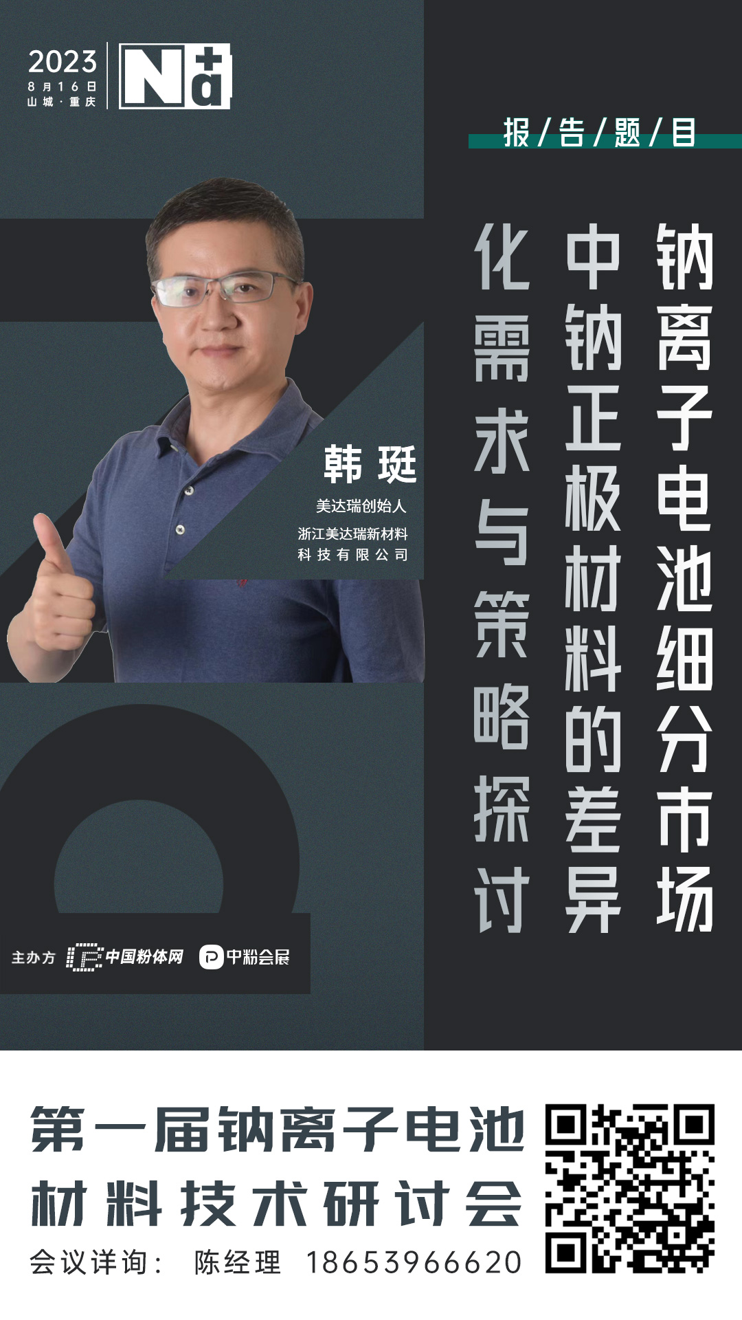 2023年8月,中國粉體網(wǎng)將在山城重慶舉辦“2023先進(jìn)正極材料技術(shù)與產(chǎn)業(yè)高峰論壇暨第一屆鈉離子電池材料技術(shù)研討會”。我們有幸邀請到浙江美達(dá)瑞新材料科技有限公司的韓珽博士為我們帶來題為《鈉離子電池細(xì)分市場中鈉正極材料的差異化需求與策略探討》的報(bào)告。