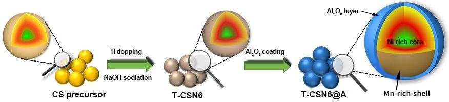 基于此,來自濟南大學原長洲教授團隊,在國際知名期刊Advanced Energy Materials上發表題為“Multi-Level Modifications Enabling Chemomechanically Stable Ni-Rich O3-Layered Cathode toward Wide-Temperature-Tolerance Quasi-Solid-State Na-Ion Batteries”的文章。在該項工作中,研究人員通過多級改性策略,包括“核殼”設計、體相摻雜和表面包覆層,設計了一種先進的NaNi0.6Co0.2Mn0.2O2正極(T-CSN6@A),得到了高化學機械穩定性和高效儲鈉的耐寬溫度準固態鈉離子電池。