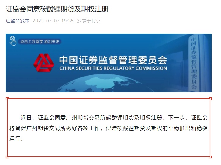 中國粉體網訊 7月7日,中國證監會發布公告顯示,同意廣州期貨交易所(下稱廣期所)碳酸鋰期貨及期權注冊,要求廣期所做好各項準備工作,保障碳酸鋰期貨的平穩推出和穩健運行。