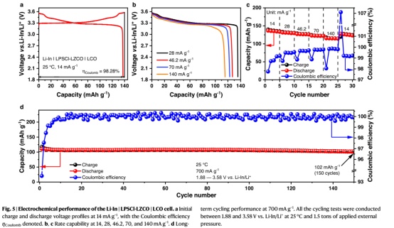 優異的離子電導率和良好的可變形性使得由Li1.75ZrCl4.75O0.5固態電解質組成的全固態電池得以展示優異的性能。使用未經包覆的LiCoO2(LCO)作為正極、Li-In合金作為負極、Li1.75ZrCl4.75O0.5作為固態電解質、Li6PS5Cl作為Li1.75ZrCl4.75O0.5和負極間緩沖層的全固態電池在25℃、14mAg−1下充放電時具備高達98.28 %的首圈庫侖效率,優于文獻中報道的同類型全固態電池。并且,該LCO基固態電池在25℃、700mAg−1的大電流密度下循環150圈后,容量基本未衰減,仍能實現102mAhg−1的放電容量,和Li2ZrCl6組成的類似電池在電流密度僅為以上數值1/10(即70mAg−1)時循環100次后的放電容量(114mAhg−1)相差無幾。