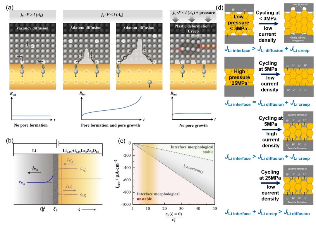 圖2.(a)示意圖顯示,如果剝離電流密度超過Li空位的擴散極限,則在Li/SE界面處形成空洞,外部壓力導致Li蠕變,從而阻止空洞形成;(b)顯示Li空位擴散的示意圖,在Li金屬中由Li空位濃度梯度控制;(c)CCD相對于SE/Li界面處的Li空位濃度與體相Li金屬中的平衡Li空位濃度之間的比率的變化;(a-c)經許可復制,版權所有2019,AmericanChemicalSociety。(d)施加的壓力和電流密度影響電化學反應導致的界面Li離子遷移、Li蠕變導致的Li擴散和體相Li金屬中空位促進的Li擴散之間的關系,這決定了SE/Li界面處的空位和Li枝晶的形成。經許可復制。[85]版權2020,AmericanChemicalSociety。