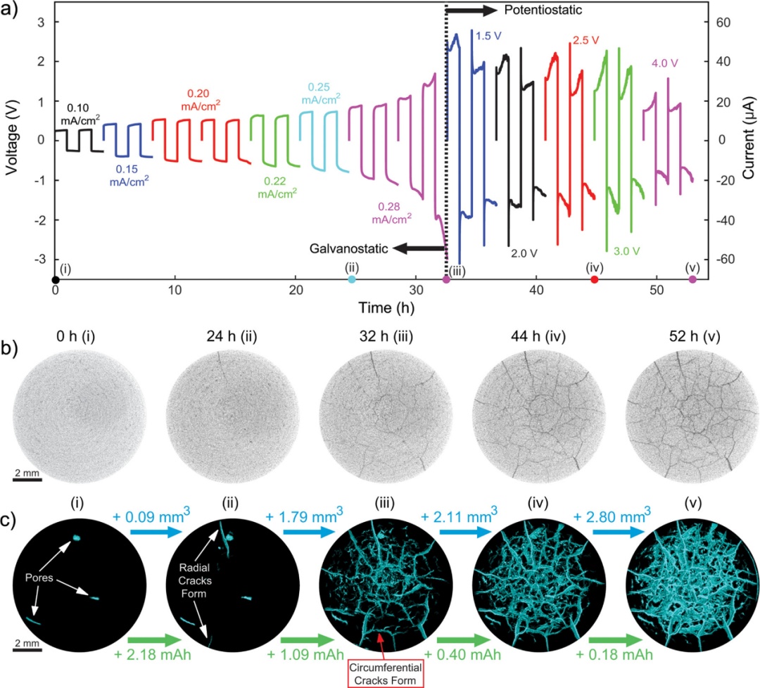圖5.(a)Li/LAGP/Li對稱電池在不同電流密度下的恒電流充電/放電和不同電壓下的恒電位充電/放電下的電化學性能;(b)SE顆粒中心的X射線CT掃描顯示,隨著電化學循環時間的增加,裂紋逐漸增多;(c)3D斷層圖顯示了在與(b)中相同的電化學循環時間下3D裂紋網絡的變化。經許可復制,版權所有2019,AmericanChemicalSociety。