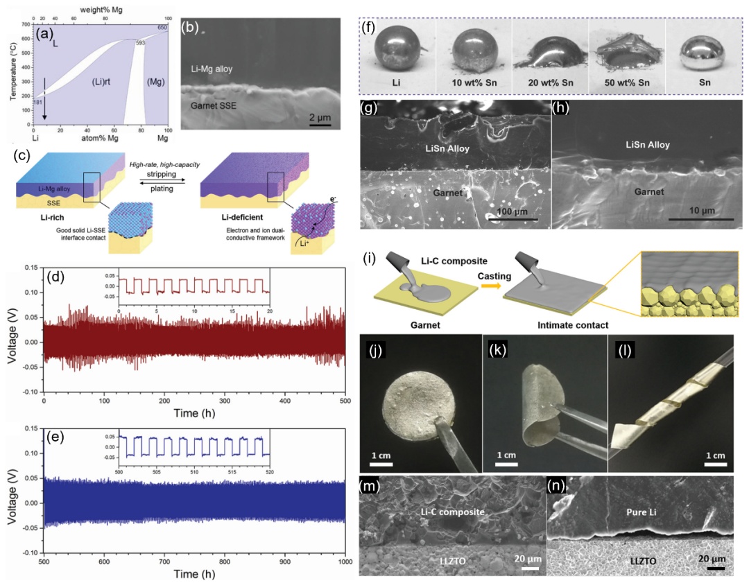 圖9.(a)Li-Mg合金的相圖;(b)SEM圖像顯示了Li-Mg合金和石榴石SE之間的緊密接觸;(c)示意圖顯示了在Li沉積/剝離之后在Li-Mg/石榴石SE界面處保持緊密接觸;Li-Mg/Ta摻雜LLZO/Li-Mg對稱電池在(d)1mAcm-2和(e)2mAcm-2恒電流充放電下的循環性能;(a-e)經許可復制,版權2018,WILEY-VCHVerlagGmbH&Co.KGaA,Weinheim。(f)不同Sn含量的熔融Li-Sn合金對LLZO型SE的潤濕性;(g-h)顯示Li-Sn和LLZO型SE之間緊密接觸的SEM圖像;(f-h)經許可復制,版權所有2017,WILEY-VCHVerlagGmbH&Co.KGaA,Weinheim。(i)示意圖顯示了鋰-石墨復合材料對摻雜Ta的LLZO的高潤濕性;(j-l)顯示鋰-石墨復合材料的高柔性的光學圖像;SEM圖像顯示(m)Li石墨復合物/(n)純Li和摻雜Ta的LLZO之間的接觸。(i-n)經許可復制,版權所有2019,WILEY-VCHVerlagGmbH&Co.KGaA,Weinheim。