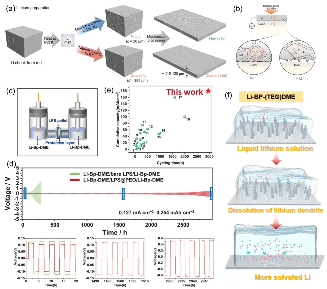 圖10.(a)示意圖顯示了制造具有不同晶粒尺寸的Li箔的程序;(b)顯示晶粒尺寸對Li蠕變影響的示意圖;(a-b)經許可復制,版權2022,Janeketal.,WileyVCHGmbH。(c)示意圖顯示了用于Li-Bp-DME液體溶液陽極的自制電池;(d)Li-Bp-DME對稱電池在0.127mAcm-2恒電流充放電下的循環性能;(e)Li-Bp-DME與其他液體溶液陽極的性能比較;(c-e)經許可復制,版權所有2021,Wiley-VCHGmbH.(f)示意圖顯示了Li-Bp-DME在溶解鋰枝晶中的作用。經許可復制,版權所有2022,ElsevierB.V.。