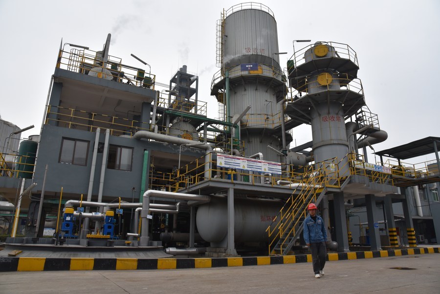 工作人員在貴州勝威福全化工有限公司內巡查。該公司建成“鈦—磷—硫—鐵”全資源循環利用新材料項目,助力企業節能改造。新華社記者 李凡 攝