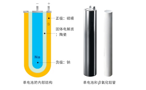 據(jù)NGK的介紹,鈉硫電池的單電池為圓筒狀的完全密封結(jié)構(gòu)。是由作為活性物質(zhì)的鈉(Na)和硫磺(S)以及精細(xì)陶瓷的電解質(zhì)構(gòu)成。Na為負(fù)極活性物質(zhì),S為正極活性物質(zhì)。在300℃的單節(jié)電池中,Na和S是液體,電解質(zhì)是固體的狀態(tài)。固體電解質(zhì)的陶瓷材料使用了Na離子導(dǎo)電性的β氧化鋁。