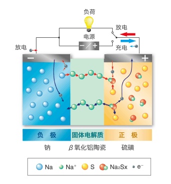 放電時,負(fù)極的鈉釋放出電子成為鈉離子,通過固體電解質(zhì)向正極移動。正極的硫和從外部回路的電子Na離子發(fā)生化學(xué)反應(yīng),變化為多硫化鈉(Na2Sx)。負(fù)極的Na被消耗減少。從負(fù)極向外部回路被釋放出的向正極移動的電子流變成為電力。