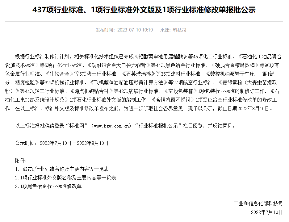 中國粉體網(wǎng)訊 近日,工信部發(fā)布消息,根據(jù)行業(yè)標(biāo)準(zhǔn)制修訂計劃,相關(guān)標(biāo)準(zhǔn)化技術(shù)組織已完成《鉛酸蓄電池用腐植酸》等46項化工行業(yè)標(biāo)準(zhǔn)、《石油化工油品調(diào)合設(shè)施技術(shù)標(biāo)準(zhǔn)》等5項石化行業(yè)標(biāo)準(zhǔn)、《現(xiàn)耐蝕合金大口徑無縫管》等44項黑色冶金行業(yè)標(biāo)準(zhǔn)、《硬質(zhì)合金精磨圓棒》等96項有色金屬行業(yè)標(biāo)準(zhǔn)、《釓鐵合金》等5項稀土行業(yè)標(biāo)準(zhǔn)、《石英玻璃棉》等35項建材行業(yè)標(biāo)準(zhǔn)、《數(shù)控機油泵轉(zhuǎn)子車床 第1部分:精度檢驗》等92項機械行業(yè)標(biāo)準(zhǔn)、《飛機整體油箱油壓載荷計算方法》等27項航空行業(yè)標(biāo)準(zhǔn)、《麥綠素粉(大麥嫩苗提取粉)》等44項輕工行業(yè)標(biāo)準(zhǔn)、《隱點機織粘合襯》等42項紡織行業(yè)標(biāo)準(zhǔn)、《空投包裝箱》1項包裝行業(yè)標(biāo)準(zhǔn)的制修訂工作,《石油化工電加熱系統(tǒng)設(shè)計規(guī)范》1項石化行業(yè)標(biāo)準(zhǔn)外文版的編制工作,《含銅抗菌不銹鋼》1項黑色冶金行業(yè)標(biāo)準(zhǔn)修改單的修改工作。在以上標(biāo)準(zhǔn)、標(biāo)準(zhǔn)外文版及標(biāo)準(zhǔn)修改單發(fā)布之前,為進一步聽取社會各界意見,現(xiàn)予以公示,截止日期2023年8月10日。