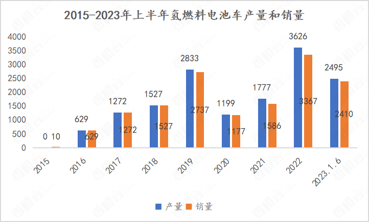 2023年上半年全國氫燃料電池汽車產銷數據分別為2495輛和2410輛,同比增加38.4%和73.5%(2022年上半年產銷數據為1803輛和1389輛)。 至此,2015年至2023年上半年,全國氫燃料電池汽車累計產量和銷量分別是15358輛和14715輛。距離2025年燃料電池汽車保有量約5萬輛的目標還有一定差距。