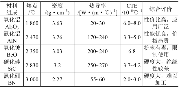 BeO陶瓷是目前較為常用的高導(dǎo)熱陶瓷基板材料,綜合性能良好,能夠滿足較高的電子封裝要求,但是其熱導(dǎo)率隨溫度波動變化較大,溫度升高其熱導(dǎo)率大幅度下降。此外,BeO粉末有劇毒,大量吸入人體后將導(dǎo)致急性肺炎,長期吸入會引起慢性鈹肺病,這大大限制了它的應(yīng)用。據(jù)了解,日本如今已經(jīng)不允許BeO的生產(chǎn),而且在歐洲BeO相關(guān)的電子產(chǎn)品也受到一定限制。