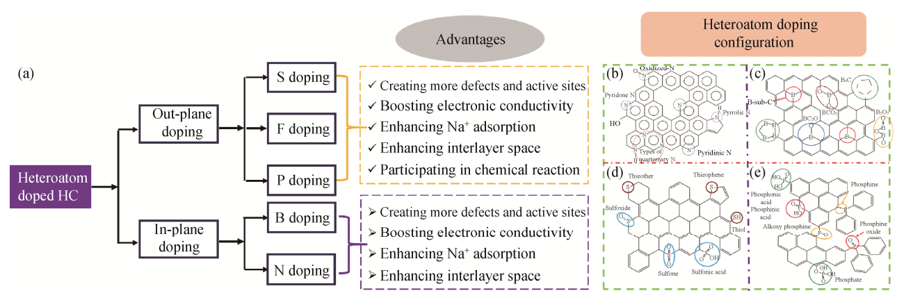 合理控制硬碳負極材料缺陷和層間距及減小表面積是提升材料化學性能的有效措施。雜原子摻雜是研究較多也是較成熟的一種控制缺陷及層間距的方法。通過引入雜原子(N、O、P、S等)和陽離子(Li+、Na+、K+、Ca2+等)可以優化硬碳材料的層間距、表面潤濕性、電子導電性等微觀性質,從而改善其儲鈉性能。針對雜原子能摻雜的研究也從最開始的摻雜性能逐漸向機理方向轉變。如圖 表6所示,一般來說,同一原子摻雜后會產生不同的摻雜構型,而構型不同往往會造成性能的不同。因此,目前關于雜原子摻雜的硬碳研究方向主要集中在雜原子摻雜種類、摻雜構型和摻雜量與性能的構效關系方面,多重摻雜的改性機理仍不清楚。