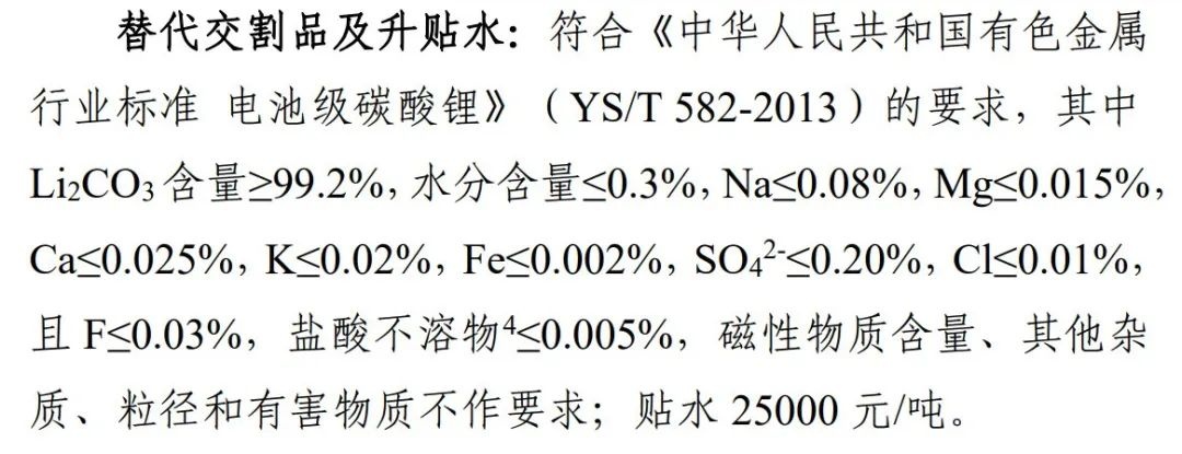 目前,國內(nèi)碳酸鋰主要用于制備電池的正極材料和電解液,電池級碳酸鋰是市場消費的主要形式。因此以電池級碳酸鋰為標準交割物,比較符合當下的產(chǎn)業(yè)應(yīng)用現(xiàn)狀。不過,在現(xiàn)貨交易中也存在工業(yè)級碳酸鋰作為電池級碳酸鋰的替代品交割的情況。為此,碳酸鋰期貨產(chǎn)品進行了“期貨價格+升貼水”設(shè)置。