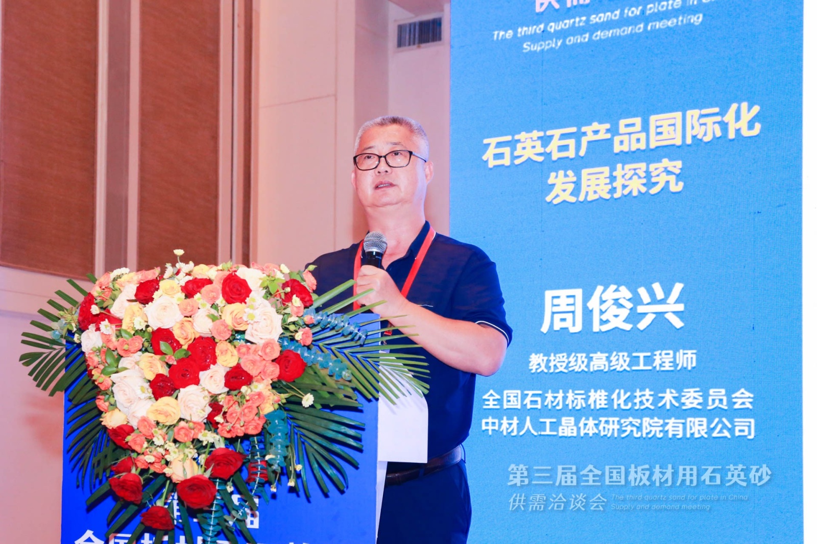 全國石材標準化技術委員會&中材人工晶體研究院有限公司的教授級高級工程師周俊興作《石英石產品國際化發(fā)展探究》報告