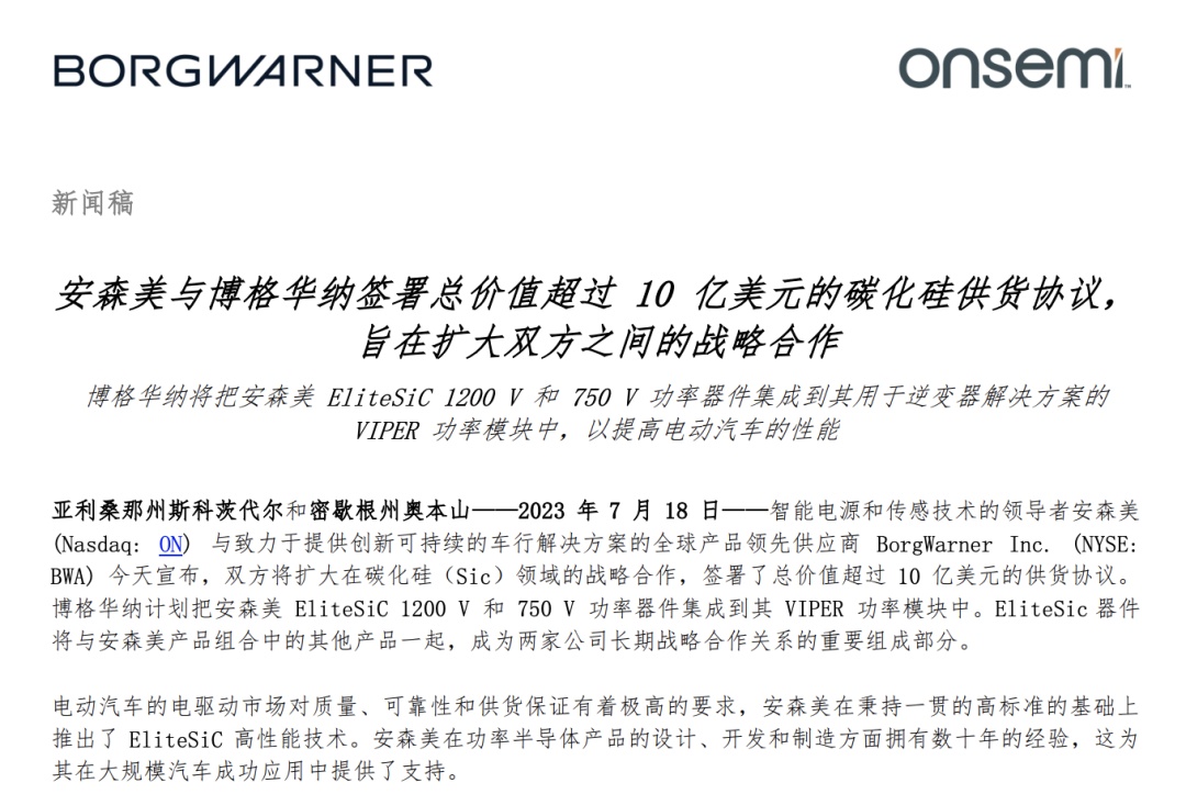 7月19日,安森美宣布與博格華納擴大碳化硅(SiC)方面的戰略合作,協議總價值超10億美元(約合人民幣72.2億元)。博格華納計劃將安森美的EliteSiC 1200 V和750 V功率器件集成到其VIPER功率模塊中。