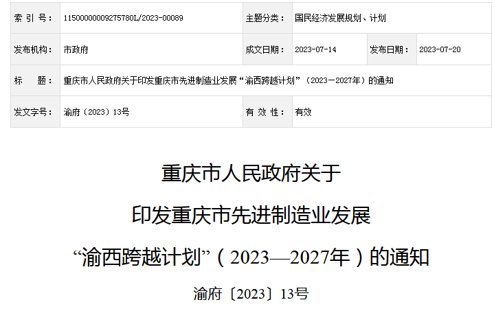7月20日,重慶市人民政府印發(fā)《重慶市先進(jìn)制造業(yè)發(fā)展“渝西跨越計(jì)劃”(2023—2027年)》通知。新能源汽車(chē)方面,通知明確表示打造世界級(jí)智能網(wǎng)聯(lián)新能源汽車(chē)零部件產(chǎn)業(yè)基地,并加快渝西地區(qū)現(xiàn)有整車(chē)產(chǎn)能優(yōu)化重整和產(chǎn)品結(jié)構(gòu)調(diào)整。