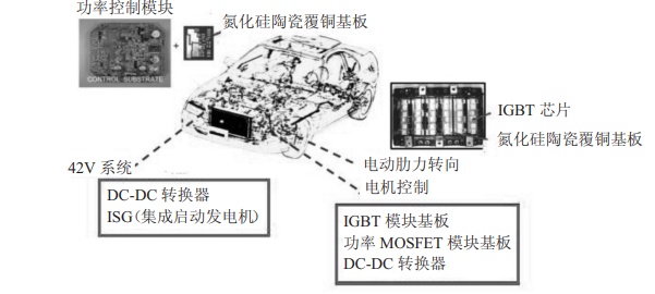 在電動汽車領域,氮化硅陶瓷基板主要用于Si IGBT和SiC MOSFET的封裝: