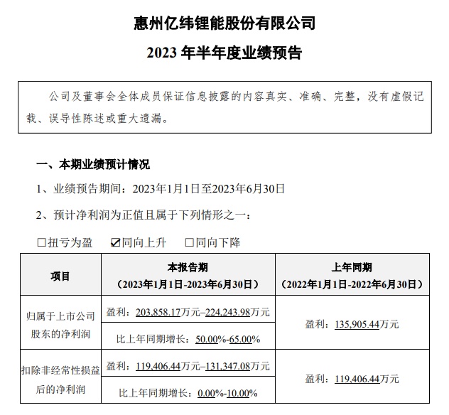中國粉體網訊 8月3日,億緯鋰能發布2023年半年度業績預告,預計上半年公司實現凈利潤20.39億元至22.42億元,同比增長50%至65%。預計實現扣非凈利潤11.94億元至13.13億元,同比增長0%至10%。
