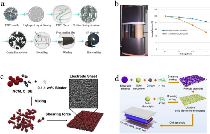 聚合物纖維化:Maxwell公司開發(fā)了一種用于超級(jí)電容器電極制造的創(chuàng)新聚合物纖維化技術(shù)。該技術(shù)利用可纖維化的聚四氟乙烯(PTFE)在高剪切力下形成纖維,將活性材料顆粒連接在一起,并通過熱壓形成自支撐的電極膜。這種技術(shù)可替代傳統(tǒng)的SC工藝,并與商業(yè)鋰電池生產(chǎn)設(shè)備兼容。Zhou等人成功地將這一技術(shù)擴(kuò)大到試驗(yàn)階段,用于制造磷酸鐵鋰(LFP)電極(圖2a)。陰極密度制造幾乎是SC電極的1.6倍。Zhang等人研究了基于PTFE的SF陽(yáng)極與不同碳材料的穩(wěn)定性。硬/軟碳陽(yáng)極表現(xiàn)出良好的循環(huán)壽命。Maxwell公司將基于PTFE的SF工藝擴(kuò)展到NMC和LIBs的石墨陽(yáng)極的制造(圖2b)。NMC/石墨電池在高負(fù)載的情況下表現(xiàn)出高倍率和良好的循環(huán)壽命。增加PTFE的纖維化程度是提高自承式電極膜機(jī)械強(qiáng)度的最有效方法之一。Zhong等人采用了不同的方法,如高溫、化學(xué)品和潤(rùn)滑來(lái)激活PTFE,以提高電極膜的機(jī)械強(qiáng)度。Hippauf等人將這種可擴(kuò)展的SF工藝用于全固態(tài)電池(ASSBs)的NMC電極制造(圖2c)。電池顯示出良好的循環(huán)穩(wěn)定性,在0.7 mA/cm2的電流下100次循環(huán)后,容量保持率為93.2%。用類似的方法,也制造出了具有代表性的固體電解質(zhì)膜,在室溫下顯示出低厚度和高離子傳導(dǎo)率(圖2d)。可擴(kuò)展性和兼容性使聚合物纖維化技術(shù)有希望取代目前的SC工藝。然而,可用粘結(jié)劑到目前為止只有PTFE。非常有必要為不同的電池系統(tǒng)開發(fā)具有廣泛電化學(xué)窗口的可纖維化粘結(jié)劑。