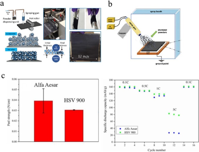 干噴沉積(DSD):Ludwig等人開發(fā)了一種將干噴沉積和熱軋相結(jié)合的方法,用于制造LCO電極(圖3a)。噴槍給帶電的干顆粒充電,帶電顆粒吸引到集流體上沉積,最終的電極通過熱軋工藝制造而成。這種方法具有良好的靈活性。由于其獨(dú)特的粘結(jié)劑分布,在機(jī)械強(qiáng)度和電化學(xué)性能方面略優(yōu)于傳統(tǒng)的電極。Al-Shroofy等人利用干噴沉積制造了NMC陰極(圖3b)。NMC、PVDF和碳黑進(jìn)行干混后,通過靜電噴槍噴灑到接地的鋁箔上,形成干式電極。PVDF的分子量的增加可以提高電極與鋁基材之間的剝離強(qiáng)度,同時(shí)較高分子量的PVDF制造的電極高倍率性能更好(圖3c)。DSD也可用于制造陽(yáng)極。Schälicke等人使用不同的氟熱塑料制造石墨陽(yáng)極,制造的石墨電極具有與傳統(tǒng)涂布制造的電極相媲美的電化學(xué)性能。DSD適用于各種常見活性材料顆粒。然而,該技術(shù)在大規(guī)模生產(chǎn)和控制電極厚度方面存在一些限制,且與當(dāng)前的鋰電池生產(chǎn)設(shè)備不兼容,其效率較低。目前對(duì)DSD的研究仍僅限于實(shí)驗(yàn)室。